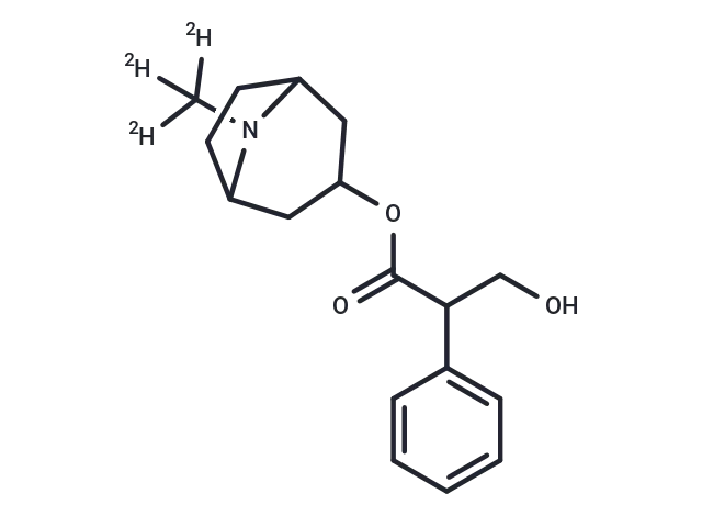 – (±)-Atropine-d3 (N-methyl-d3) is a deuterated compound of (±)-Atropine. (±)-Atropine has a CAS number of 51-55-8. Atropine Sulfate is the sulfate salt of atropine, a naturally-occurring alkaloid isolated from the plant Atropa belladonna. Atropine functions as a sympathetic, competitive antagonist of muscarinic cholinergic receptors, thereby abolishing the effects of parasympathetic stimulation.