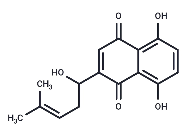 – (Rac)-Shikonin (Anchusin) is a natural red naphthoquinone pigment, has antimicrobial, anti-tumor, and anti-inflammatory effects; a purified shikonin preparation is widely used for the production of medicinals, cosmetics, and some food products; shikonin also enters into the antiinflammatory ointment and cream compositions used for the treatment of burns. It can suppress the cell viability, adhesion, invasion and migratory ability of MGC-803 cells through TLR2- or NF-κB-mediated pathway.