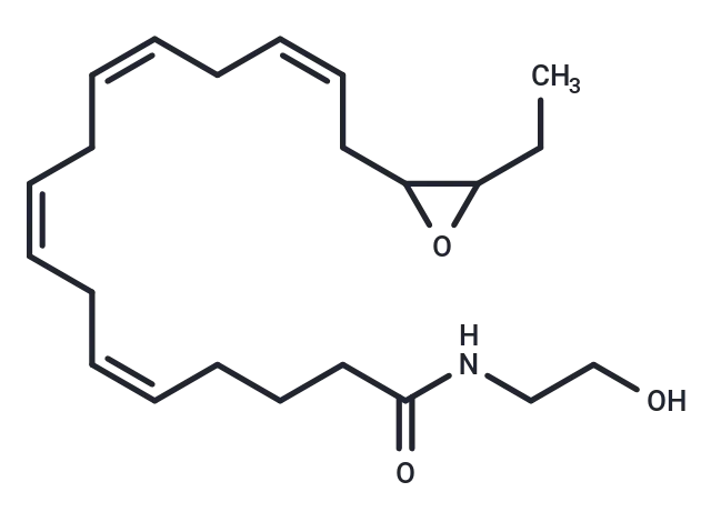 – (±)17(18)-EpETE-Ethanolamide, an ω-3 endocannabinoid epoxide, originates from eicosapentaenoic ethanolamide (EPEA) through cytochrome P450 (CYP) epoxygenases action and is decomposed by soluble epoxide hydrolase (sEH) and fatty acid amide hydrolase (FA, AH). Its endogenous synthesis occurs in LPS-stimulated and EPEA-supplemented BV-2 microglia cells, a process inhibited by the CYP inhibitor ketoconazole. This compound mitigates IL-6 and nitrite levels while enhancing IL-10 production following LPS exposure in BV-2 microglia. At a dose of 50 µM, it prevents platelet aggregation caused by arachidonic acid but not that triggered by ADP, collagen, or ristocetin. Additionally, it facilitates the dilation of constricted bovine coronary arteries (ED50= 1.1 µM) and blocks VEGF-driven tubulogenesis in human microvascular endothelial cells (HMVECs).