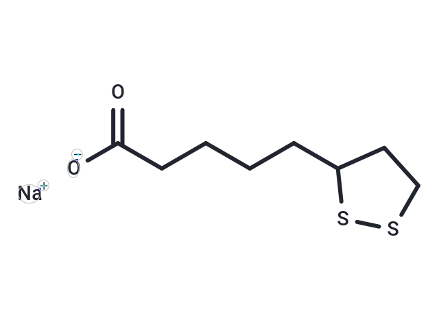 – α-Lipoic Acid (Thioctic acid) sodium, an essential cofactor for mitochondrial enzyme complexes, functions as an antioxidant. It suppresses NF-κB-dependent activation of HIV-1 LTR [1] [2] [3] and induces ER (endoplasmic reticulum) stress-mediated apoptosis in hepatoma cells [4]. Furthermore, when combined with CPUL1 to form the self-assembled nanoaggregate CPUL1-LA NA, α-Lipoic Acid sodium enhances antitumor efficacy compared to CPUL1 alone [5].