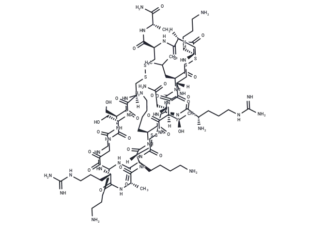 – O=C1[C@]2(NC(=O)[C@H](CCCCN)NC(=O)[C@H](CC(C)C)NC(=O)[C@H](CC(N)=O)NC(=O)[C@H](CCCCN)NC(=O)[C@@]3(CSSC[C@H](NC([C@H](CCCNC(=N)N)N)=O)C(=O)N[C@@](CSSC2)(C(=O)N[C@@]([C@@H](C)O)(C(=O)NCC(=O)N[C@@H](CCCCN)C(=O)N[C@@H](CCCCN)C(=O)NCC(=O)N[C@@H](CO)C(=O)N[C@@](CSSC[C@@H](C(N[C@H](C(N)=O)C)=O)N1)(C(=O)N[C@@H](CO)C(=O)NCC(=O)N[C@@H](CCCNC(=N)N)C(=O)N[C@@H](C)C(=O)N3)[H])[H])[H])[H])[H]
