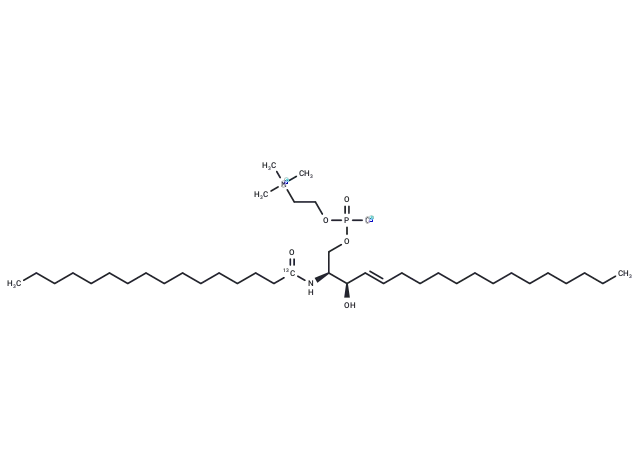 – 13C C16 Sphingomyelin is an isotopically enriched form of C16 sphingomyelin with carbon-13 occurring on the fatty acid portion. It is intended for use as an internal standard for the quantification of C16 sphingomyelin by GC- or LC-MS. C16 Sphingomyelin is a form of sphingomyelin containing palmitate (16:0) at the variable acylation position. It is the most common form of sphingomyelin found in eggs and is less abundant in the brain and in milk. C16 Sphingomyelin interacts with cholesterol in ordered lipid domains (lipid rafts). Sphingomyelinases remove phosphorylcholine from C16 sphingomyelin to produce C16 ceramide. While ceramides commonly induce apoptosis, ceramides with different fatty acid chain lengths might direct distinct functions and, in some cases, reduce apoptosis.