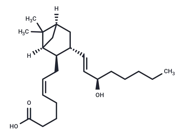 – 15(R)-Pinane thromboxane A2 is the (R)-epimer of pinane thromboxane A2 . 15(R)-PTA2 does not inhibit collagen-induced platelet aggregation (IC50s = 120-130 μM). It does not affect gastric tone in isolated rat gastric fundus when used at concentrations of 0.5 or 1.5 μg/ml and is less effective than PTA2 at inhibiting prostaglandin-induced contraction of isolated rat stomach muscle.