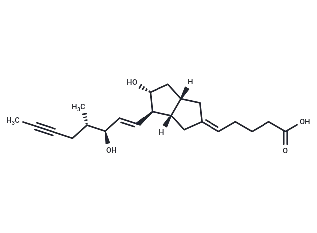 – Iloprost is a second generation structural analog of prostacyclin (PGI2) with about ten-fold greater potency than the first generation stable analogs, typified by carbaprostacyclin. Iloprost binds with equal affinity to the recombinant human IP and EP1 receptors with a Ki value of 11 nM. Most preparations of iloprost contain 16(S) and 16(R) stereoisomers. 16(S)-Iloprost potently inhibits platelet aggregation with an IC50 value of 3.5 nM.