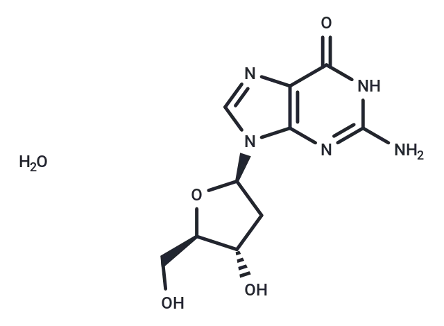 – 2′-Deoxyguanosine monohydrate (Guanine-2′-deoxyriboside) is a nucleoside consisting of the base guanine and the sugar deoxyribose. It is like guanosine, but with one oxygen atom removed. It is a nucleoside component of DNA. 2′-Deoxyguanosine monohydrate can be converted to 8-hydroxy-deoxyguanosine (8-OHdG) due to hydroxyl radical attack at the C8 of guanine. 8-OHdG is a sensitive marker of the DNA damage This damage, if left unrepaired, has been proposed to contribute to mutagenicity and cancer promotion.