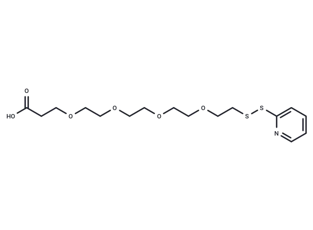 – (2-Pyridyldithio)-PEG4 acid is a four-unit cleavable polyethylene glycol (PEG) linker specifically designed for the synthesis of antibody-drug conjugates (ADCs)[1]. It serves as a crucial component in the conjugation of antibodies and drugs, enabling targeted drug delivery and enhanced therapeutic efficacy. This linker possesses a (2-pyridyldithio) group at one end, facilitating the attachment of the linker to the specific site on the antibody molecule. The PEG4 chain provides the necessary flexibility and biocompatibility for optimal drug release while maintaining stability throughout the circulation in the body. Ultimately, (2-Pyridyldithio)-PEG4 acid is instrumental in the development and advancement of ADCs, a promising approach in cancer therapy.