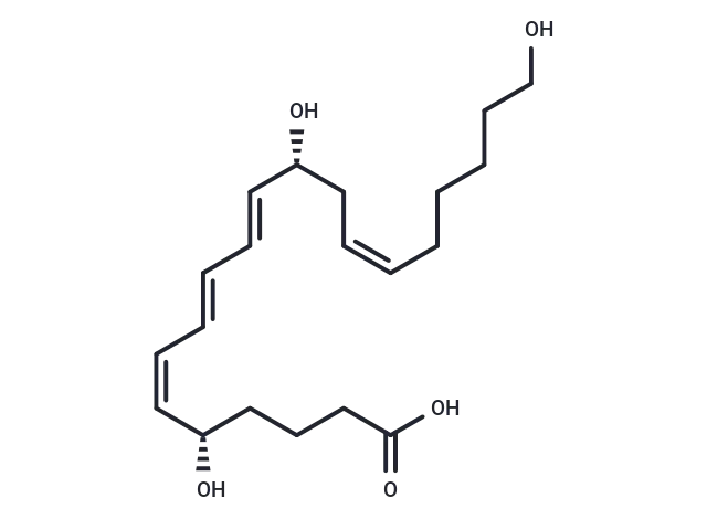 – 20-hydroxy LTB4 is a metabolite of LTB4 in human neutrophils. In human leukocytes, LTB4 is inactivated by the enzyme LTB4 20-hydroxylase. 20-hydroxy LTB4 is not only much less active (~5%) compared to LTB4 in causing degranulation of PMNL, but actually inhibits LTB4-induced degranulation of human neutrophils (Ki = 13.3 nM). However, 20-hydroxy LTB4 is as active as LTB4 in contracting parenchymal strips from guinea pig lung. 20-hydroxy LTB4 retains considerable ligand binding affinity at the BLT2 receptor, but does not appear to function as an agonist.