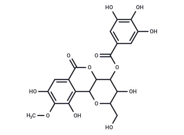 – 4-O-Galloylbergenin shows significant 2,2-diphenyl-1-picrylhydrazyl (DPPH) free-radical scavenging activity with EC50 7.8 uM, it shows more antioxidant activity than the positive control vitamin C (EC50 = 28.3 uM).