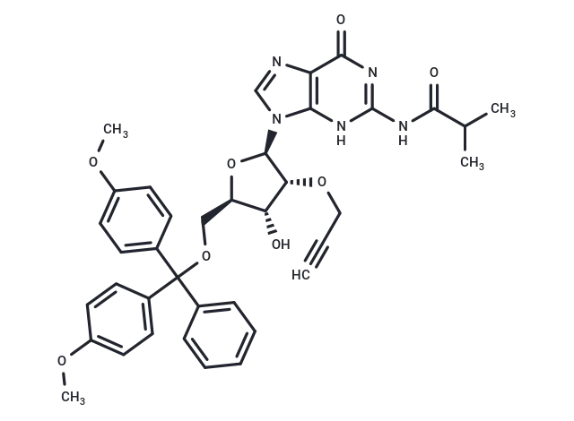 – 5′-O-DMT-N2-isobutyryl-2′-O-propargylguanosine is a nucleoside derivative featuring 2′-modification, with protected NH2/OH groups.