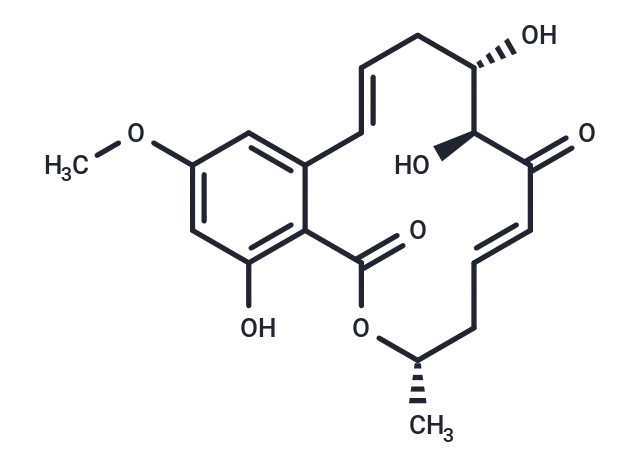 – (5E)-7-Oxozeaenol is a resorcylic acid lactone that has been found in the fungus MSX 63935 and has enzyme inhibitory and anticancer activities.1,2 It inhibits TGF-β-activated kinase 1 (TAK-1; IC50 = 1.3 μM).1 (5E)-7-Oxozeaenol inhibits proliferation of MCF-7, H460, SF-268, HT-29, and MDA-MB-435 human cancer cells with IC50 values of 4.9, 1.2, 5.6, 4.4, and 5.5 μM, respectively.2