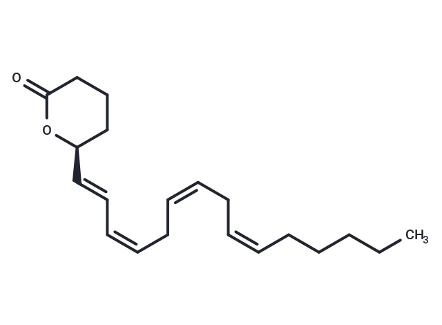 – 5(S)-HETE lactone is a cyclic ester formed by acid-catalyzed nucleophilic addition of the C-5 hydroxyl to the C-1 carboxyl of 5(S)-HETE. The ability of (±)5-HETE lactone to inhibit rat basophilic leukemia cell 5-lipoxygenase (IC50 = 27 μM) may be entirely due to the 5(S) isomer, but the enantiomers have not been tested separately.
