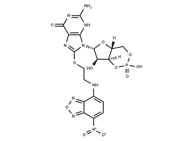 – 8-NBD-cGMP is a fluorescent analog of cyclic guanosine monophosphate (cGMP), acting as an effective membrane-permeable fluorescent activator for cGMP-dependent protein kinase isozymes I α and I β. This compound exhibits negligible fluorescence in aqueous solutions, but emits intense fluorescence in hydrophobic environments (such as hydrophobic protein binding sites).