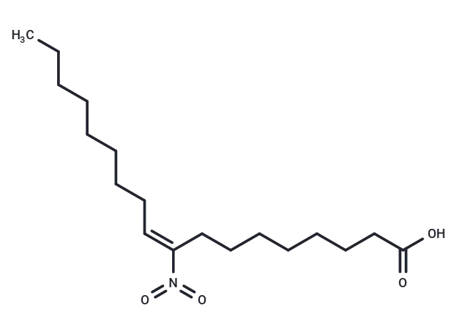 – Nitrated unsaturated fatty acids, such as 10- and 12-nitrolinoleate , cholesteryl nitrolinoleate, and nitrohydroxylinoleate, represent a new class of endogenous lipid-derived signalling molecules. LNO2 isomers serve as potent endogenous ligands for PPARγ and can also decompose or be metabolized to release nitric oxide. 9-Nitrooleate is one of two regioisomers of nitrooleate, the other being 10-nitrooleate (OA-NO2; used for the mixture of isomers), which are formed by nitration of oleic acid in approximately equal proportions in vivo. Peroxynitrite, acidified nitrite, and myeloperoxidase in the presence of H2O2 and nitrite, all mediate the nitration of oleic acid. OA-NO2 is found in human plasma as the free acid and esterified in phospholipids at concentrations of 619 ± 52 nM and 302 ± 369 nM, respectively. OA-NO2 activates PPARγ approximately 7-fold at a concentration of 1 μM and effectively promotes differentiation 3T3-L1 preadipocytes to adipocytes at 3 μM.