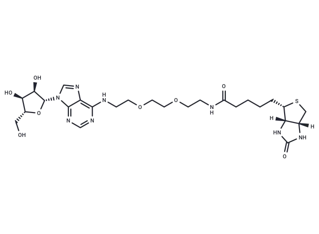 – Adenosine 2′-PEG-Biotin, a bioreagent derived from adenosine, modulates cellular signaling pathways by mimicking the action of endogenous adenosine and binding to its receptors. This compound is used in research related to bioprobes, biosensors, and diagnostic agents.