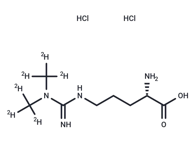– NG,NG-dimethyl-L-arginine-d6 (ADMA-d6) (hydrochloride) is intended for use as an internal standard for the quantification of NG,NG-dimethyl-L-arginine by GC- or LC-MS. ADMA is an endogenous inhibitor of nitric oxide synthase (NOS). It is formed from arginine by protein arginine methyltransferases (PRMTs) and degraded by dimethylarginine dimethylaminohydrolases (DDAHs) and alanine-glyoxylate aminotransferase 2 (AGXT2). ADMA levels are increased concomitant with an increase in blood pressure in Dahl salt-sensitive rats fed a high-salt diet. ADMA levels are increased in the plasma in a variety of endothelial dysfunction-related diseases, including hypertension, congestive heart failure, and end-stage renal disease.