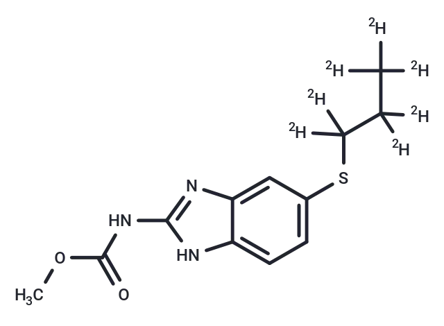 – Albendazole-d7 is intended for use as an internal standard for the quantification of albendazole by GC- or LC-MS. Albendazole is an orally bioavailable benzimidazole anthelmintic that is active against a variety of helminths, including liver flukes, tapeworms, and roundworms. It eliminates Trichostrongylus in the fourth stomach of cattle and sheep when orally administered at doses ranging from 2.5 to 10 mg/kg as well as other species in the fourth stomach and the small and large intestine. Albendazole (0.05% in the diet) protects mice against lethal infection with A. suum larvae. It also inhibits growth of HT-29 human colorectal cancer cells (IC50 = 0.12 µM), halts the cell cycle at the G2/M phase, and induces apoptosis. In an HT-29 mouse xenograft model, it inhibits peritoneal tumor growth when administered intraperitoneally at a dose of 150 mg/kg but not when administered orally. Albendazole inhibits mammalian tubulin polymerization and inhibits binding of [3H]mebendazole t……