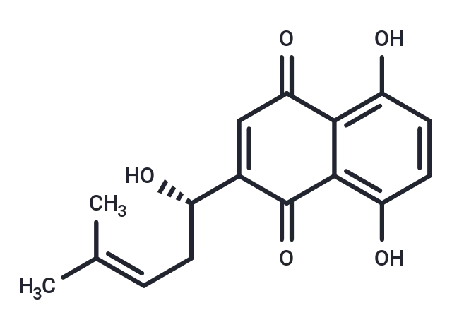 – (-)-Alkannin (Shikonin) is a natural red naphthoquinone pigment, has antimicrobial, anti-tumor, and anti-inflammatory effects; a purified shikonin preparation is widely used for the production of medicinals, cosmetics, and some food products; shikonin also enters into the antiinflammatory ointment and cream compositions used for the treatment of burns. It can suppress the cell viability, adhesion, invasion and migratory ability of MGC-803 cells through TLR2- or NF-κB-mediated pathway.
