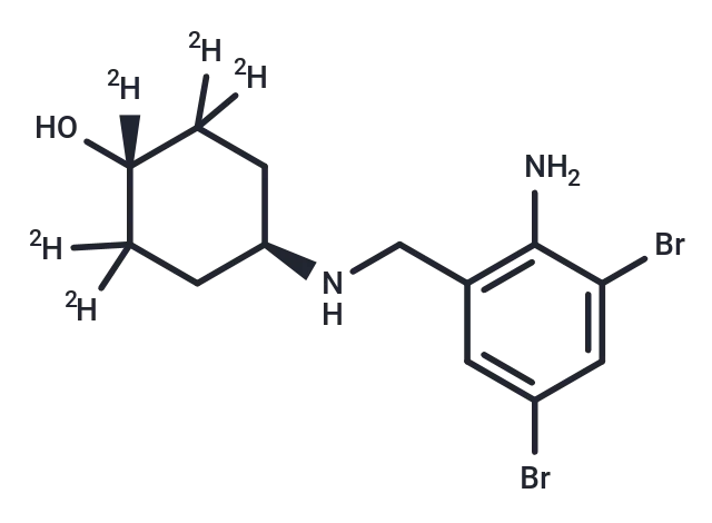 – Ambroxol-d5 is intended for use as an internal standard for the quantification of ambroxol by GC- or LC-MS. Ambroxol is an expectorant and active metabolite of bromhexine. It decreases short-circuit currents in electrically stimulated isolated canine tracheal epithelial cells when applied submucosally. Ambroxol decreases IL-13-induced production of mucin 5AC (MUC5AC) in primary human airway epithelial cells and inhibits IL-13-induced decreases in the mucociliary transport rate of endogenous particles in the same cells. Ambroxol increases phenol red secretion, a marker of expectorant activity, in mice when administered at doses of 30, 60, or 120 mg/kg. Formulations containing ambroxol have been used in the treatment of acute or chronic respiratory conditions.