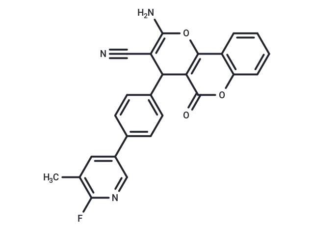 – N#CC1=C(OC=2C=3C=CC=CC3OC(=O)C2C1C4=CC=C(C=C4)C=5C=NC(F)=C(C5)C)N