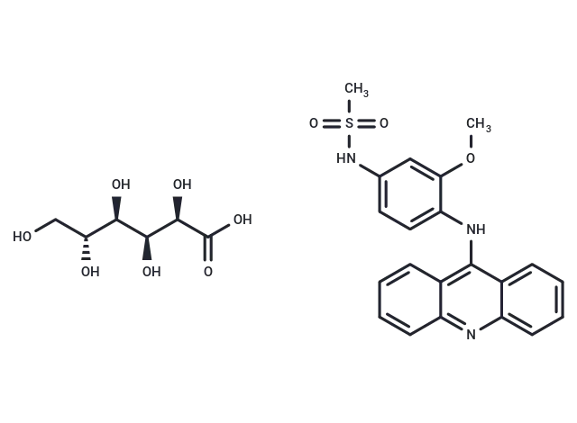 – Amsacrine gluconate is an aminoacridine derivative with potential antineoplastic activity. Although its mechanism of action is incompletely defined, amsacrine may intercalate into DNA and inhibit topoisomerase II, resulting in DNA double-strand breaks, arrest of the S/G2 phase of the cell cycle, and cell death.