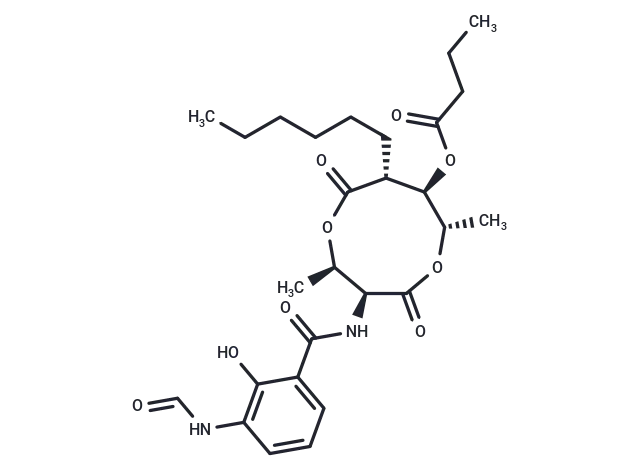 – CCCCCC[C@@H]1[C@@H](OC(=O)CCC)[C@H](C)OC(=O)[C@@H](NC(=O)c2cccc(NC=O)c2O)[C@@H](C)OC1=O