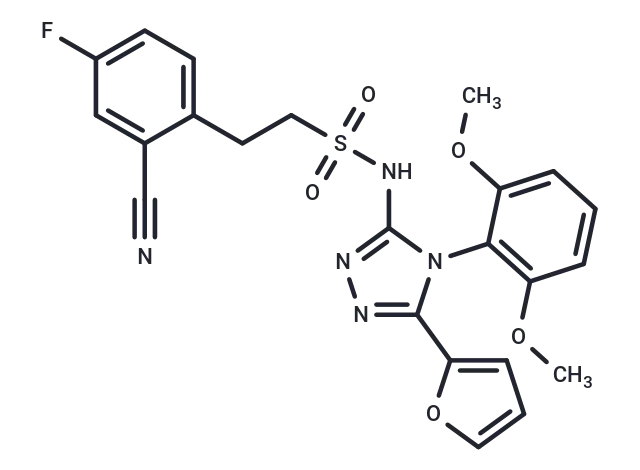 – N#CC1=CC(F)=CC=C1CCS(=O)(=O)NC2=NN=C(C=3OC=CC3)N2C=4C(OC)=CC=CC4OC
