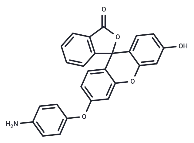 – APF is an aromatic amino-fluorescein derivative and fluorescent probe for highly reactive radicals. It has low intrinsic fluorescence, however, upon oxidation by hydroxyl radical, hypochlorite ion, and certain peroxidase intermediates, it is converted to the highly fluorescent molecule fluorescein, facilitating the detection of highly reactive biological radicals. APF is not oxidized by nitric oxide (NO), hydrogen peroxide (H2O2), or other oxidants. Fluorescein displays excitation/emission maxima of 490/515 nm, respectively.