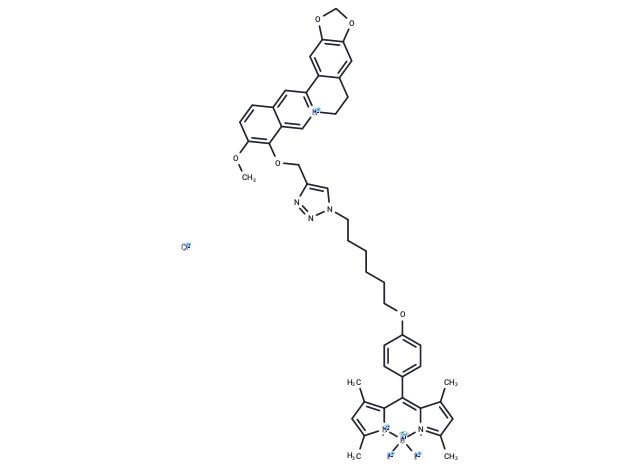 – [Cl-].COc1ccc2cc3-c4cc5OCOc5cc4CC[n+]3cc2c1OCc1cn(CCCCCCOc2ccc(cc2)C2=C3C(C)=CC(C)=[N]3[B+3]([F-])([F-])[N-]3C(C)=CC(C)=C23)nn1