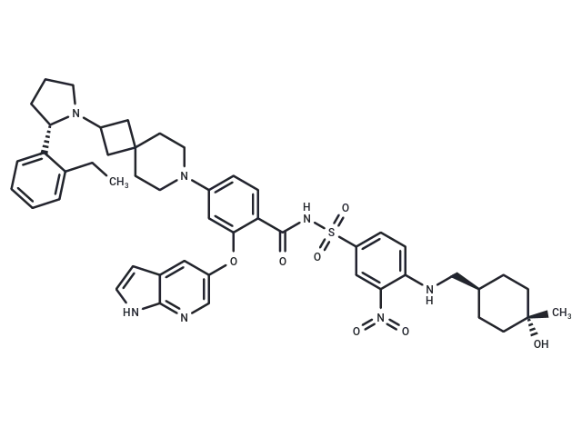 – CCc1ccccc1[C@@H]1CCCN1C1CC2(C1)CCN(CC2)c1ccc(C(=O)NS(=O)(=O)c2ccc(NC[C@H]3CC[C@](C)(O)CC3)c(c2)N(=O)=O)c(Oc2cnc3[nH]ccc3c2)c1 |wU:8.8,41.46,wD:38.41,41.45,(10.07,9.11,;9.75,10.61,;10.9,11.64,;12.36,11.17,;13.5,12.2,;13.18,13.7,;11.72,14.18,;10.58,13.15,;9.11,13.63,;8.64,15.09,;7.1,15.09,;6.62,13.63,;7.87,12.72,;7.87,11.18,;8.95,10.09,;7.87,9,;6.78,10.09,;9.2,8.23,;9.2,6.69,;7.87,5.92,;6.53,6.69,;6.53,8.23,;7.87,4.38,;9.2,3.61,;9.2,2.07,;7.87,1.3,;7.87,-.24,;6.53,-1.01,;9.2,-1.01,;10.53,-.24,;9.76,1.1,;11.3,-1.57,;11.87,.53,;13.2,-.24,;14.53,.53,;14.53,2.07,;15.87,2.84,;15.87,4.38,;17.2,5.15,;18.53,4.38,;19.87,5.15,;19.87,6.69,;20.4,8.14,;21.38,6.43,;18.53,7.46,;17.2,6.69,;13.2,2.84,;11.87,2.07,;13.2,4.38,;14.53,5.15,;11.87,5.15,;6.53,2.07,;5.2,1.3,;3.86,2.07,;3.86,3.61,;2.53,4.38,;1.2,3.61,;-.27,4.09,;-1.17,2.84,;-.27,1.6,;1.2,2.07,;2.53,1.3,;6.53,3.61,)|