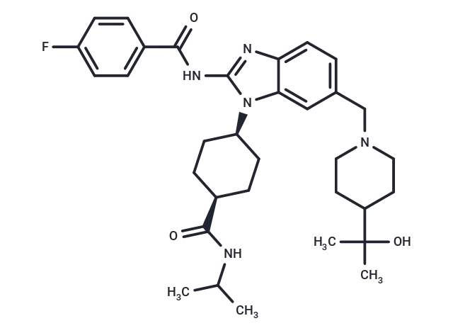 – CC(C)NC(=O)[C@H]1CC[C@H](CC1)n1c(NC(=O)c2ccc(F)cc2)nc2ccc(CN3CCC(CC3)C(C)(C)O)cc12