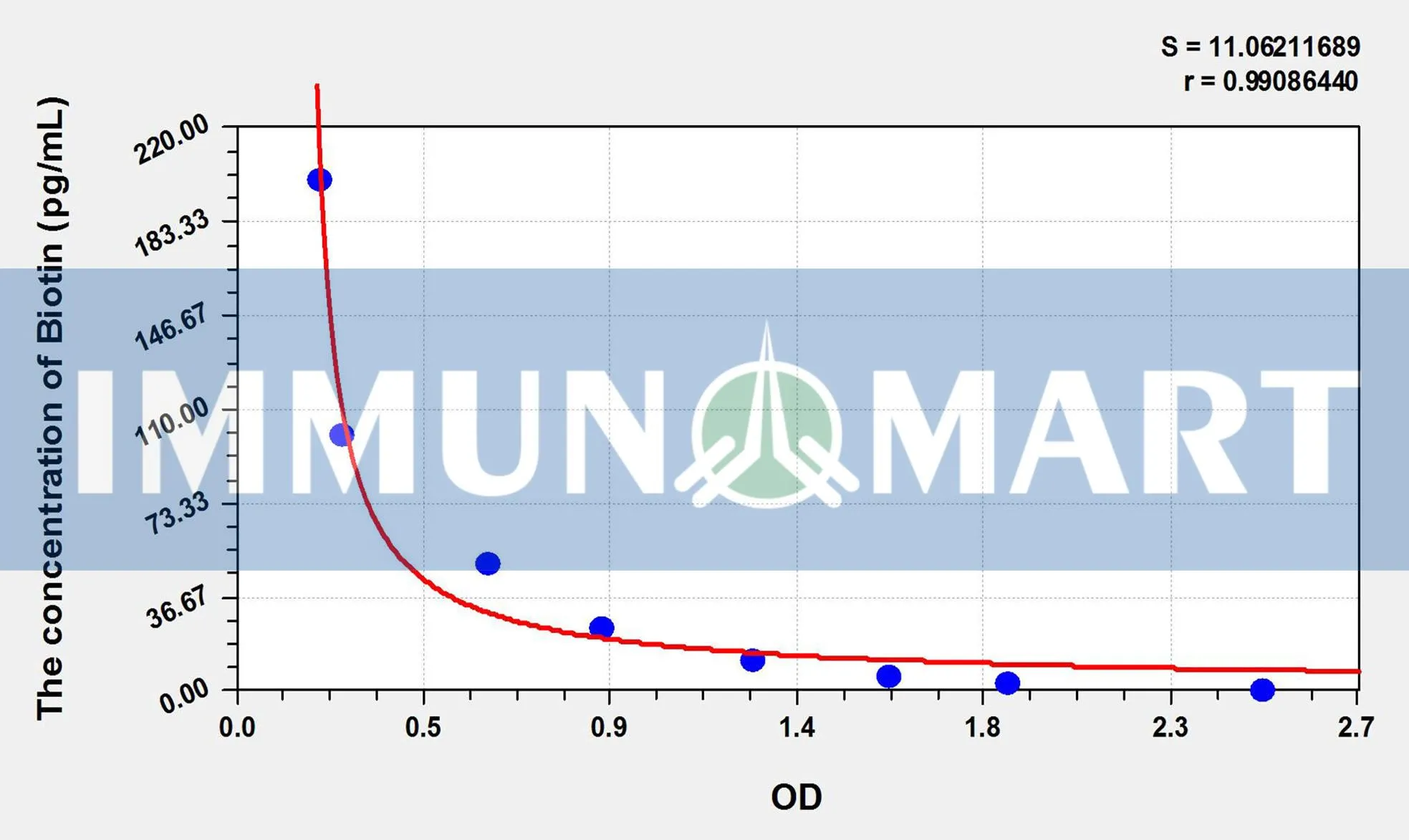 – This assay employs the competitive inhibition enzyme immunoassay technique. The microtiter plate provided in this kit has been pre-coated with Biotin protein. Standards or samples are added to the appropriate microtiter plate wells then with a biotin-conjugated antibody specific to Biotin. Next, Avidin conjugated to Horseradish Peroxidase (HRP) is added to each microplate well and incubated. After TMB substrate solution is added. The enzyme-substrate reaction is terminated by the addition of sulphuric acid solution and the color change is measured spectrophotometrically at a wavelength of 450nm ± 10nm. The concentration of Biotin in the samples is then determined by comparing the OD of the samples to the standard curve.
