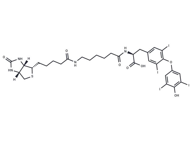 – Biotin-hexanamide-(L-Thyroxine) is a biotinylated derivative of L-Thyroxine (Levothyroxine; T4), used as a synthetic hormone in hypothyroidism research [1].