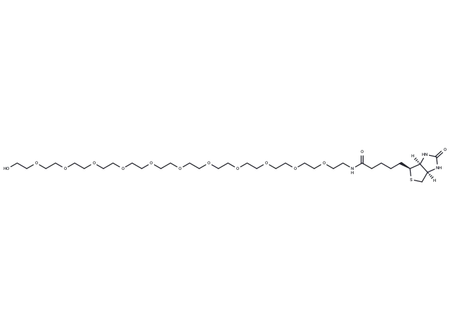 – (+)-Biotin-PEG12-OH, a PEG-based linker for PROTACs, joins two essential ligands to form PROTAC molecules, facilitating selective protein degradation via the ubiquitin-proteasome system within cells.