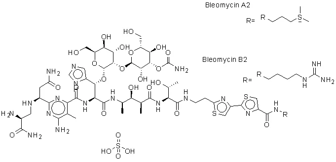 – Bleomycin Sulfate (Blenoxane) is a glycopeptide antibiotic, an inhibitor of DNA synthesis. Bleomycin Sulfate causes DNA strand breaks but not RNA strand breaks. Bleomycin Sulfate has antitumor activity.