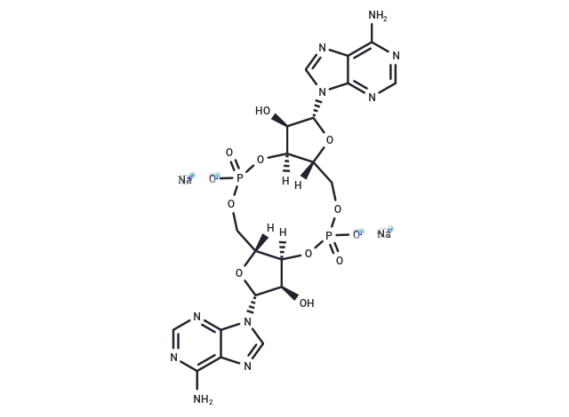 – Cyclic diadenylate (c-di-AMP) sodium functions as a STING agonist by binding to the STING transmembrane protein, thus activating the TBK3-IRF3 signaling pathway. This activation prompts the production of type I IFN and TNF. Additionally, c-di-AMP sodium serves as a bacterial second messenger in Gram-positive bacteria, where it plays crucial roles in regulating cell growth, survival, and virulence, as well as the host immune response. It also acts as a potent mucosal adjuvant by stimulating both humoral and cellular responses [1] [2] [3] [4].