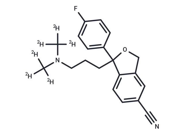 – Citalopram-d6 is a deuterated compound of Citalopram. Citalopram has a CAS number of 59729-33-8. Citalopram (Lu 10-171 is an orally active, selective serotonin reuptake inhibitor (SSRI), a selective 5-hydroxytryptamine reuptake inhibitor, and a racemic mixture of the S(+)-enantiomer (Escitalopram) and the R(-)-enantiomer.Citalopram exhibits antidepressant activity and enhances serotonergic neurotransmission. It can be used to study Alzheimer’s disease.