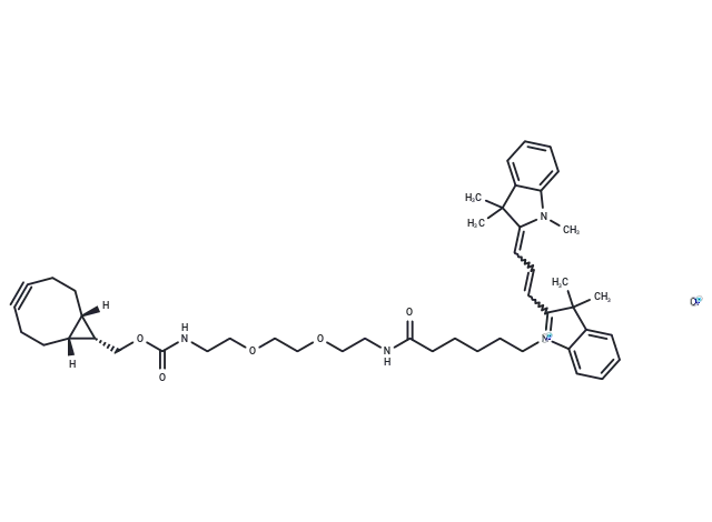 – Cy3-PEG2-endo-BCN, a Cyanine 3 (Cy3) dye derivative with two polyethylene glycol (PEG) units, incorporates the hydrophobic bidentate macrocyclic ligand endo-BCN, which facilitates the synthesis of macrocyclic complexes. In click chemistry, endo-BCN undergoes a catalyst-free reaction with azide-bearing molecules to yield stable triazoles.
