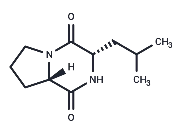 – Cyclo(L-Leu-L-Pro) is a compound from Pseudomonas sesquiterpenes BC42 that exhibits antifungal activity, inhibiting fungal pathogens, the proliferation of Aspergillus flavus, conidial germination, and conidial formation, making it useful for agricultural biocontrol.