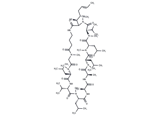 – Cyclosporin H (CsH), a specific inhibitor of FPR1, inhibited lung inflammation in the ALI models. CsH significantly attenuated MTDs or NFP-induced inflammatory lung injury and activation of MAPK and AKT pathways. Cyclosporin H is a viral transduction enhancer which increases lentiviral transduction up to 10-fold in human cord blood-derived hematopoietic stem and progenitor cells (HSPCs). When combined with Rapamycin or Prostaglandin E2 Cyclosporin H displays an additive effect. Cyclosporin H lacks immunosuppressant activity of Cyclosporin A.