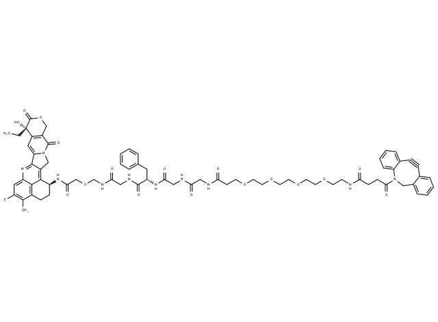 – DBCO-PEG4-GGFG-Dxd is a conjugate used in antibody-drug conjugates (ADCs) exhibiting potent antitumor activity. It incorporates Dxd, a DNA topoisomerase I inhibitor, connected through the cleavable linker DBCO-PEG4-GGFG [1]. This compound functions as a click chemistry reagent, featuring a DBCO group capable of strain-promoted alkyne-azide cycloaddition (SPAAC) with azide-containing molecules.