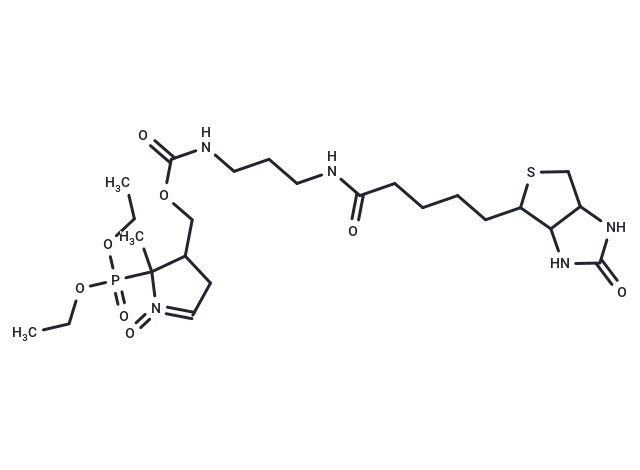– DEPMPO is a nitrone that is used to spin trap reactive O-, N-, S-, and C-centered radicals and allow their characterization when used in association with electron spin resonance. It is noted for the stability of adducts formed. DEPMPO can be used in vitro or in vivo, as it crosses lipid bilayer membranes and is a good trapping agent in biological systems. DEPMPO-biotin is a biotinylated form of DEPMPO which retains the outstanding persistency of its adducts. The biotin moiety offers an effective means for monitoring biodistribution in cells, tissues, and organs when used with an avidin-conjugated reporter. Importantly, DEPMPO-biotin binds free radicals, such as S-nitroso groups, on proteins, producing adducts that can be analyzed via the biotin tag. This direct labeling of S-nitrosothiols (SNO) thus serves as an effective alternative to the more cumbersome biotin-switch method for monitoring SNO formation.
