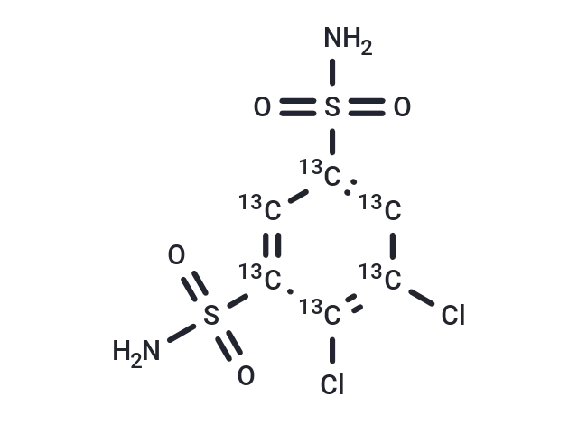 – Dichlorphenamide-13C6is intended for use as an internal standard for the quantification of dichlorphenamide by GC- or LC-MS. Dichlorphenamide is a sulfonamide and an orally bioavailable carbonic anhydrase (CA) inhibitor (Kis = 1.20, 38, 50, and 50 nM for the human CA isoforms CAI, CAII, CAIX, and CAXII, respectively).1It lowers intraocular pressure in rabbits when 50 μl of a 10% solution is applied topically to the eye.2Dichlorphenamide rescues the potassium deficiency and prevents insulin-induced paralysis in a rat model of familial hypokalemic periodic paralysis when administered at a dose of 5.6 mg/kg per day for ten days.3Formulations containing dichlorphenamide have been used in the treatment of glaucoma and primary periodic paralysis.