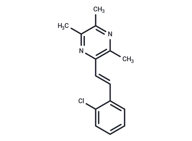 – (E)-2-(2-Chlorostyryl)-3,5,6-trimethylpyrazine (CSTMP) is a stilbene derivative with antioxidant and anticancer activities. It stimulates proliferation of hydrogen peroxide-damaged ECV-304 cells (EC50 = 24.9 nM). CSTMP reduces hydrogen peroxide-induced release of lactate dehydrogenase (LDH) in and increases viability of human umbilical vein endothelial cells (HUVECs) in a concentration-dependent manner via inhibition of apoptosis. It reverses hydrogen peroxide-induced release of malondialdehyde (MDA) and decreases in superoxide dismutase (SOD) and glutathione peroxidase (GSH-Px) activities as well as increases constitutive nitric oxide synthase (cNOS) activity and nitric oxide (NO) production in HUVECs. CSTMP also induces cell death of A549 non-small cell lung cancer (NSCLC) cells in an IRE1α-dependent manner through induction of IRE1α-TRAF2-ASK1 complex-mediated endoplasmic reticulum (ER) stress and mitochondrial apoptosis.