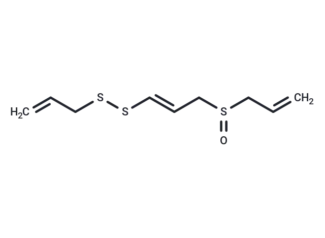 – (E)-Ajoene is a disulfide that has been found inA. sativumand has diverse biological activities.1,2,3,4It is active against Gram-positive and Gram-negative bacteria (MICs = 10-250 and 150->500 μg/ml, respectively) and fungi (MICs = 15-50 μg/ml).1(E)-Ajoene inhibits proliferation of a variety of cancer cells, including MDA-MB-231 breast, HeLa cervical, and WHCO1 esophageal cancer cells (IC50s = 18.6, 61, and 39.2 μM, respectively).2It also inhibits human glutathione reductase andT. cruzitrypanothione reductase when used at a concentration of 200 μM.3(E)-Ajoene (25 mg/kg) is neuroprotective in a gerbil model of ischemia-reperfusion injury, reducing reactive astrocytosis and microgliosis in the hippocampal CA1 region.4