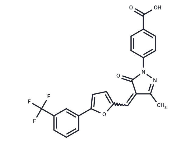 – O=C(O)C1=CC=C(C=C1)N2N=C(C(=CC=3OC(=CC3)C=4C=CC=C(C4)C(F)(F)F)C2=O)C