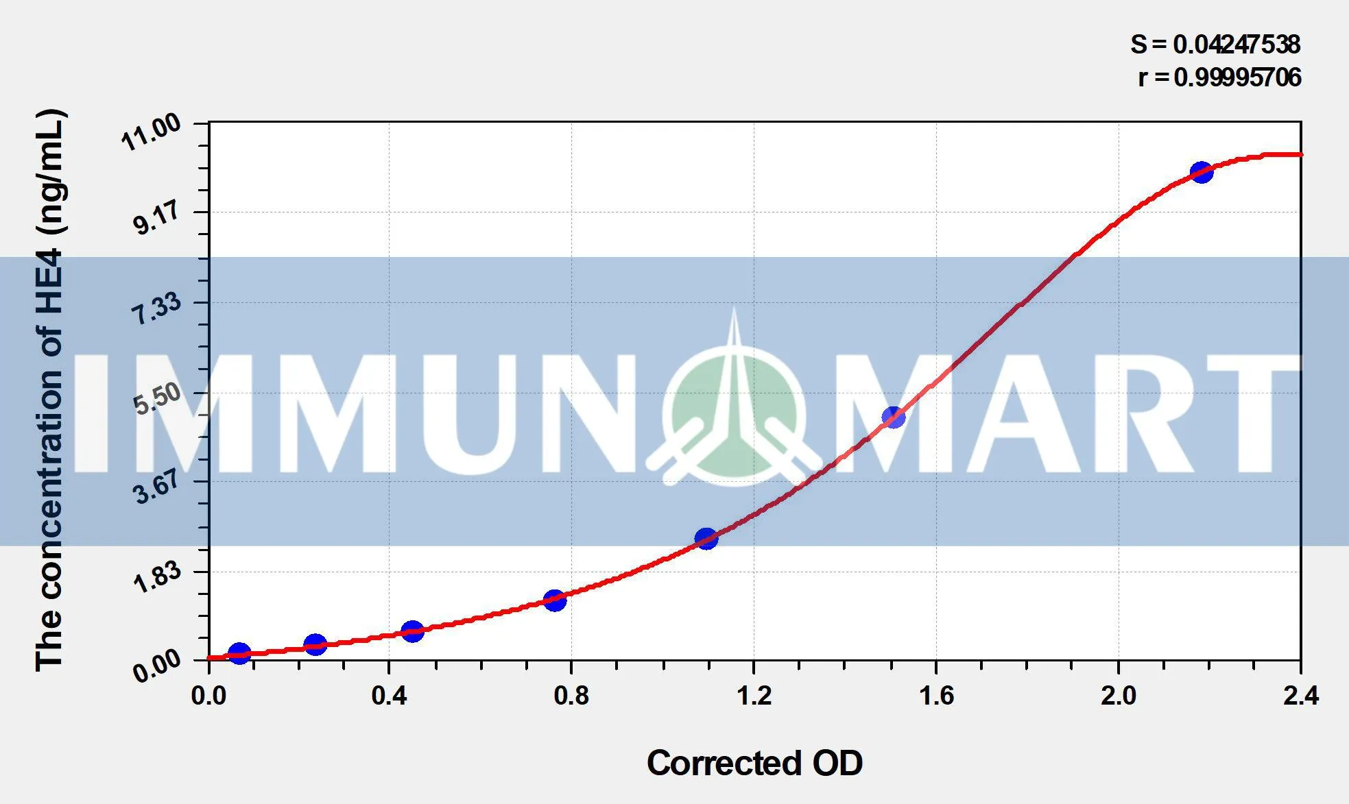 – The test principle applied in this kit is Sandwich enzyme immunoassay. The microtiter plate provided in this kit has been pre-coated with an antibody specific to Human HE4, and the Human HE4 standard plate wells that pre-coated using protein-related techniques are provided separately. Standard/Sample Diluent Buffer or samples are added to the appropriate microtiter plate wells ,then added a HRP-conjugated antibody specific to Human HE4. After TMB substrate solution is added, only those wells that contain Human HE4 and HRP-conjugated antibody will exhibit a change in color. The enzyme-substrate reaction is terminated by the addition of sulphuric acid solution and the color change is measured spectrophotometrically at a wavelength of 450nm ± 10nm. The concentration of Human HE4 in the samples is then determined by comparing the OD of the samples to the standard curve.