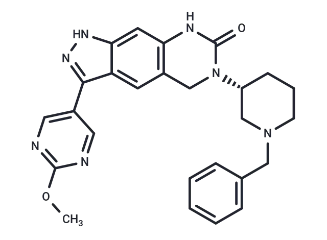 – COc1ncc(cn1)-c1n[nH]c2cc3NC(=O)N(Cc3cc12)[C@@H]1CCCN(Cc2ccccc2)C1