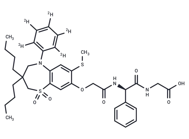 – Elobixibat-d5 is a deuterated compound of Elobixibat. Elobixibat has a CAS number of 439087-18-0. Elobixibat is an inhibitor of the ileal bile acid transporter (IC50: 0.13 nM, 0.53 nM, and 5.8 nM for mouse, human, and canine IBAT). Elobixibat can be used in studies about chronic idiopathic constipation.