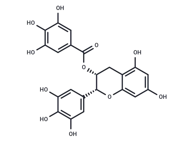 – (-)-Epigallocatechin Gallate (EGCG) is a phenolic antioxidant polyphenol flavonoid found in plants such as green and black tea, which inhibits telomerase and DNA methyltransferase, blocks the activation of EGF receptors and HER-2 receptors, inhibits cellular oxidation, and prevents free radical damage to cells.