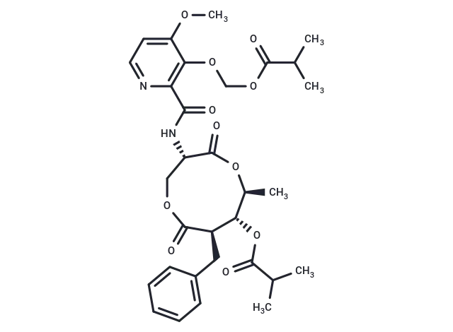 – O(COC(C(C)C)=O)C1=C(C(N[C@@H]2C(=O)O[C@@H](C)[C@H](OC(C(C)C)=O)[C@@H](CC3=CC=CC=C3)C(=O)OC2)=O)N=CC=C1OC